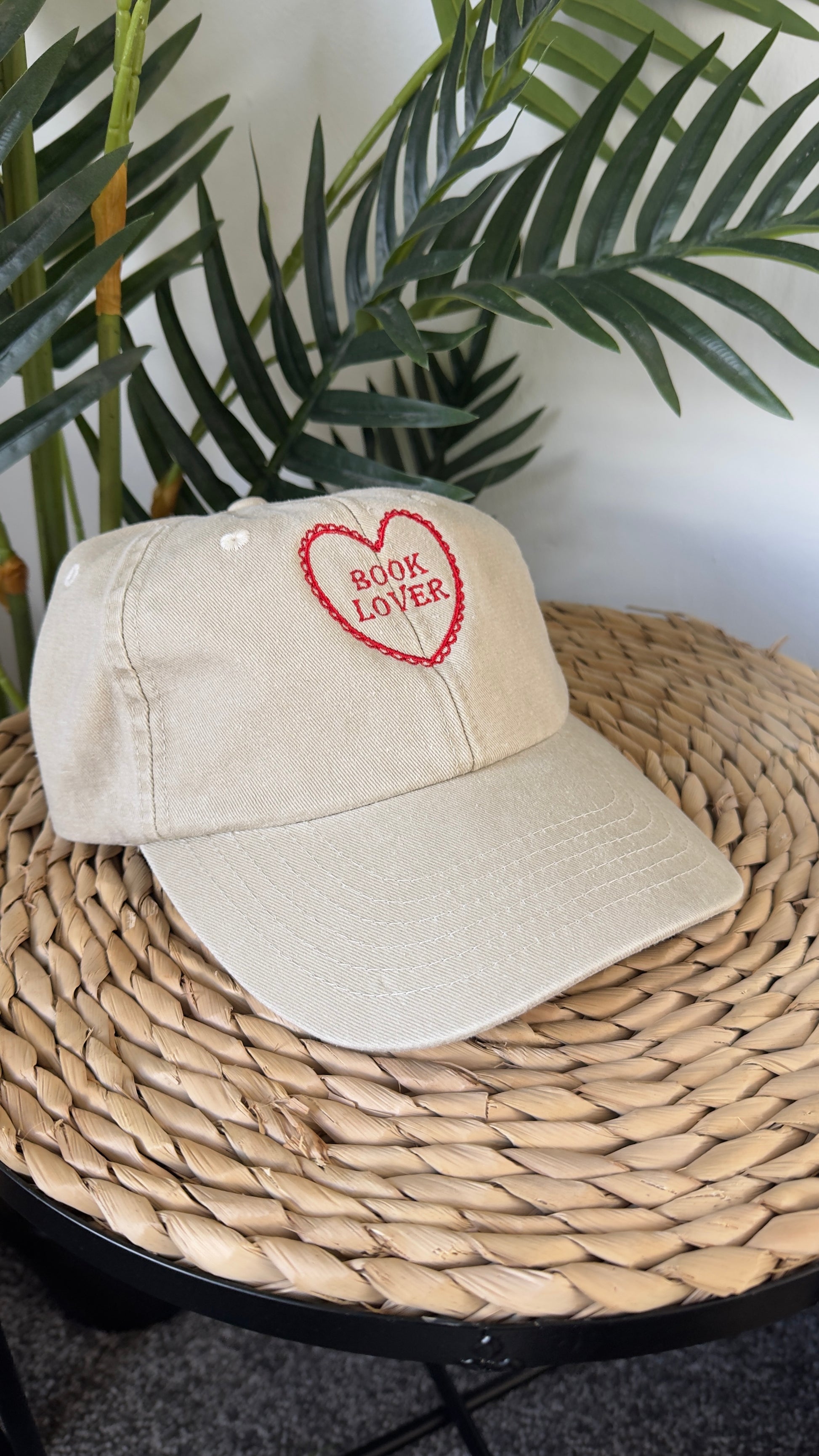 🧢 Embroidery: “Book Lover” inside a red scalloped heart (front)